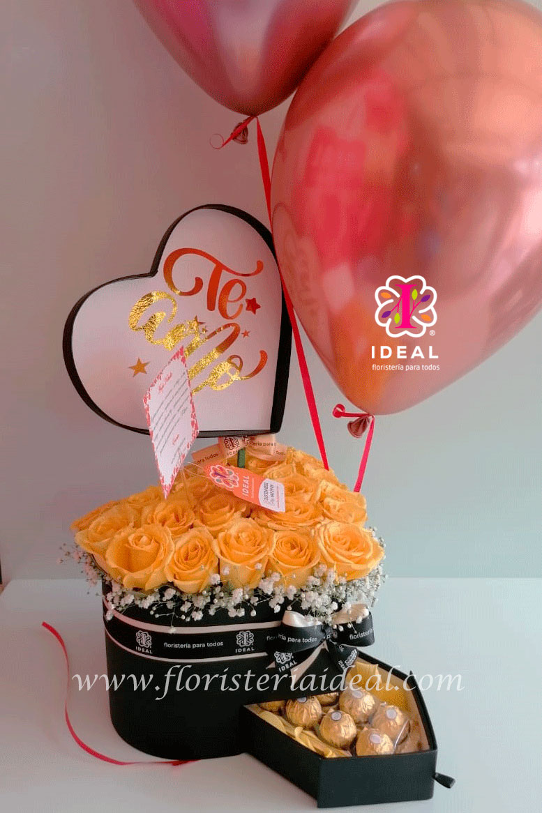 Linda caja en forma de corazón elaborada en delicadas rosas y bellos follajes esta acompañada de ricos chocolates ferreros rocher mas bellos globos y linda tarjeta para la ocasion.