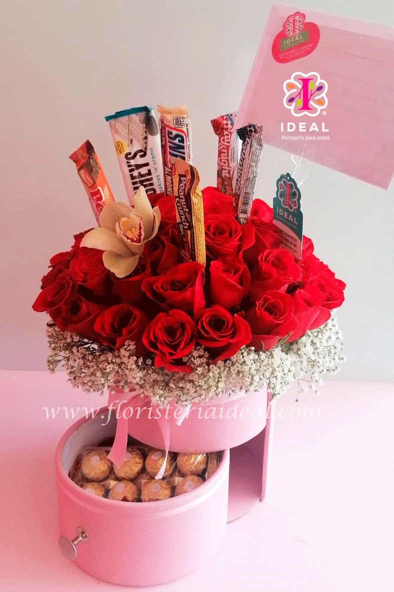 Hermosa caja con doble compartimiento, elaborado en bellas rosas rojas chocolates surtidos mas caja de chocolates Ferrero Rocher y su respectiva caja de Ferrero Rocher de 8 unidades y su respectiva tarjeta para la ocasión.
