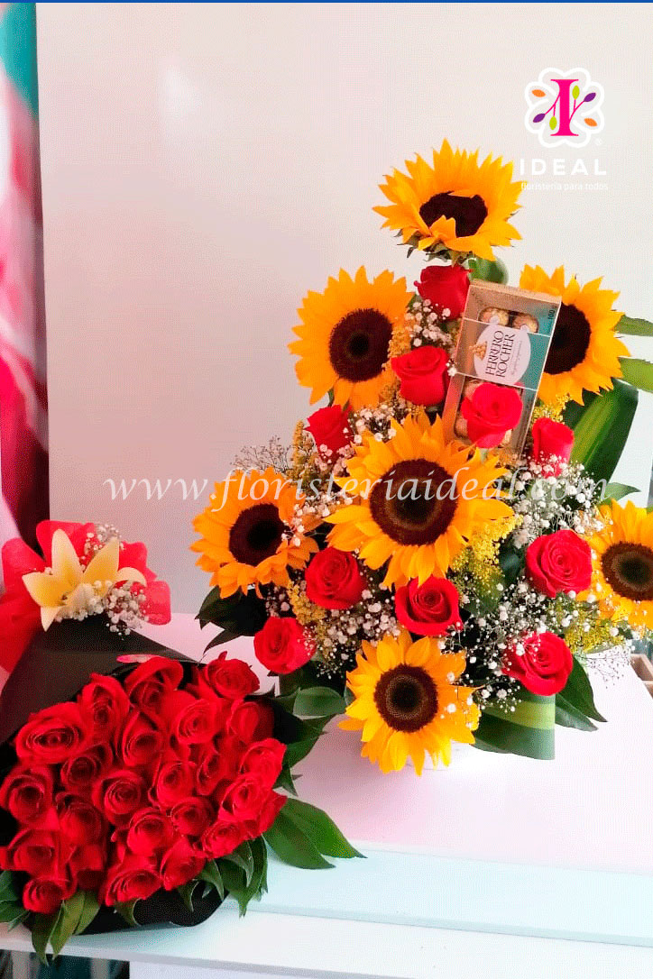 Espectacular Arreglo de girasoles y rosas acompañado de Bouquet de rosas ideal para una linda ocasión, incluye tarjeta personalizada y caja de chocolates ferreros rocher.