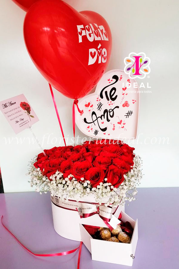 Hermoso arreglo floral en caja de corazón elaborado en bellas rosas rojas, acompañada de tapa decorada, chocolate Ferrero Rocher, globos en helio y linda tarjeta para la ocasión.