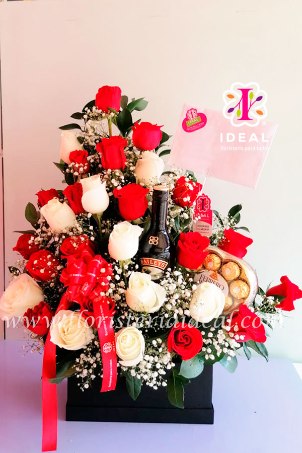 Delicado arreglo floral elaborado en bellas rosas rojas y blanca acompañada de exclusiva botella de crema de whisky bailesys de 750ml y chocolate Ferrero Rocher