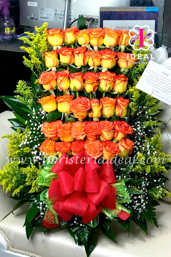 Espectacular arreglo elaborado en bellas rosas confeti y frescos follajes verdes lo acompaña linda tarjeta para la ocasión.