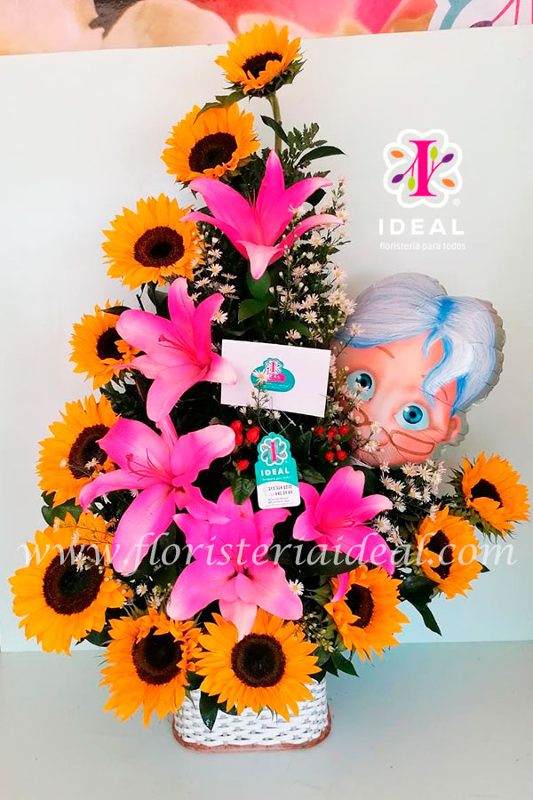 Delicado Arreglo Floral elaborado en forma semiluna de girasoles y lirios, acompañado de hermoso globo de abuelita y tarjeta para la ocasión.