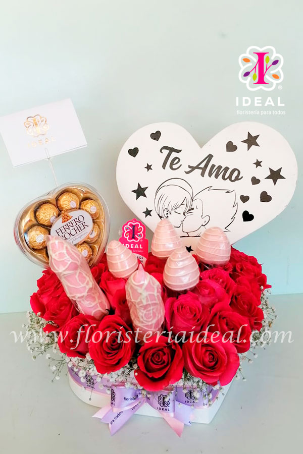 Delicado arreglo floral elaborado en bellas rosas fucsias, acompañado de fresas bañadas en chocolate y caja de chocolates ferrero rocher de corazón incluye y tarjeta para la ocasión.
