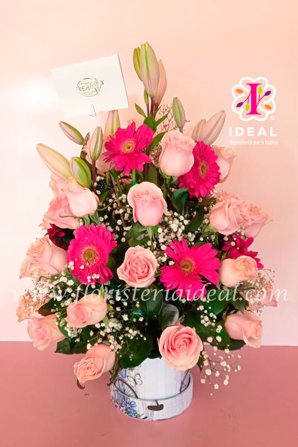 Delicado arreglo floral elaborado en bellas rosas rosadas y fucsias acompañado de tarjeta para la ocasión.