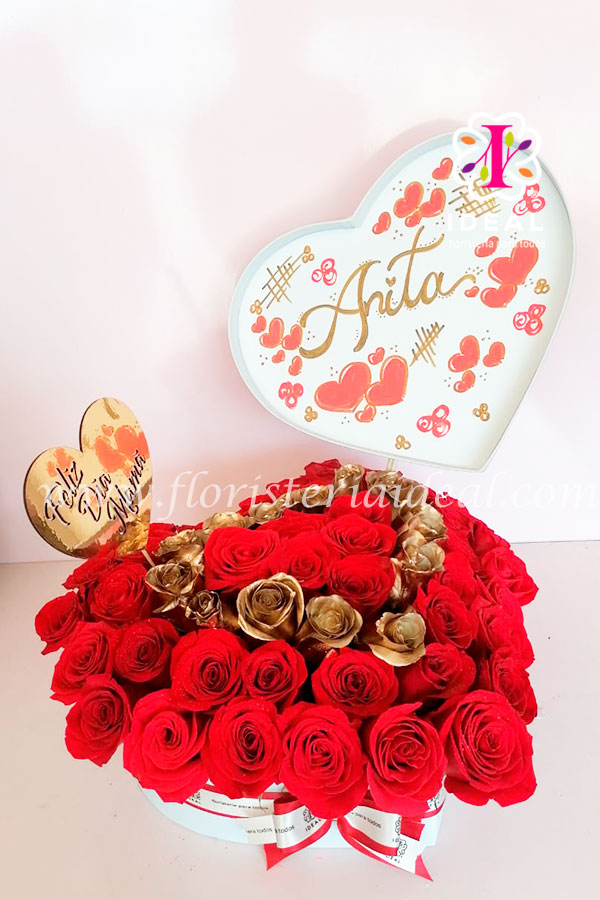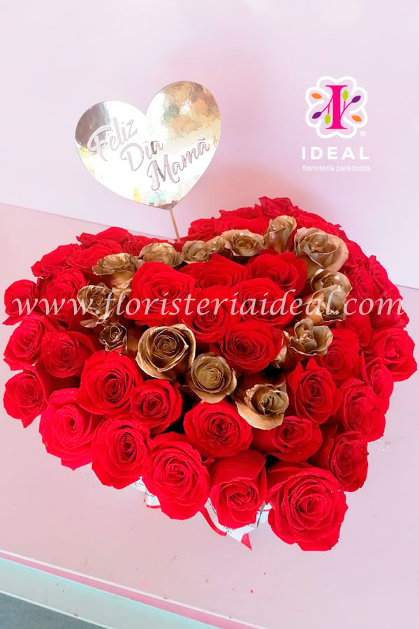 Especial Caja de Corazón elaborada en bellas rosas rojas y doradas incluye tarjeta para la ocasión.