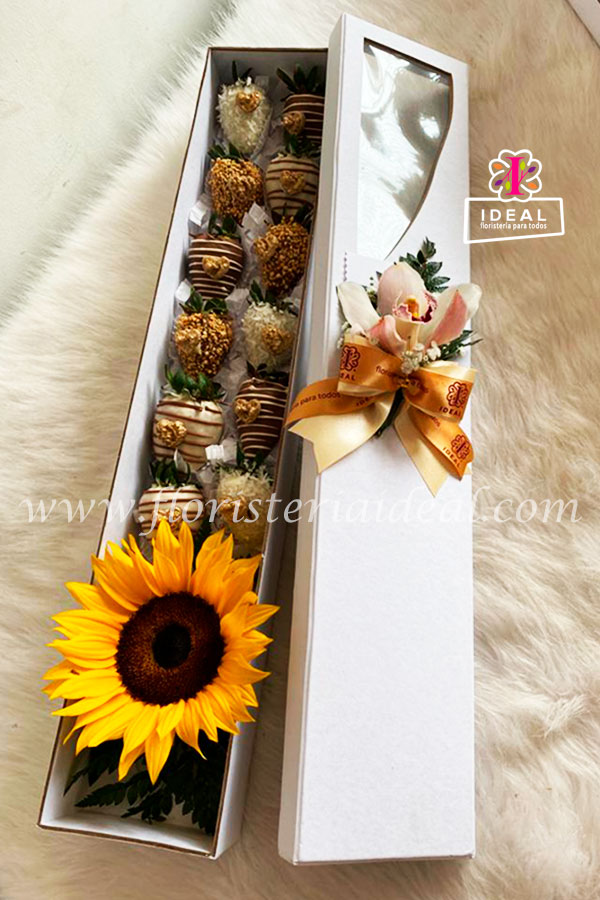 Delicada caja de ricas fresas bañadas en chocolate acompañada de un bello girasol y linda orquídea incluye tarjeta para la ocasión.