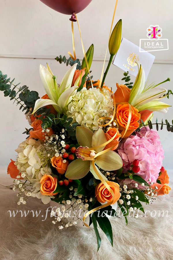 Lindo arreglo floral de forma redonda elaborado en bellas flores tropicales y lindos follajes incluye tarjeta para la ocasión y globos en helio