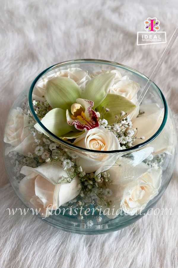 Delicada orquídea acompañada de lindas rosas blancas, elaborado en una pecera de vidrio incluye tarjeta para la ocasión.