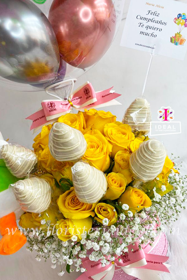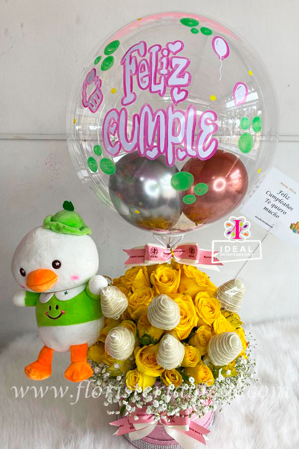 Hermoso arreglo floral elaborado en bellas rosas amarillas acompañado de fresas bañadas en chocolate y globo borbuja personalizado + lindo peluche y tarjeta para la ocasión.