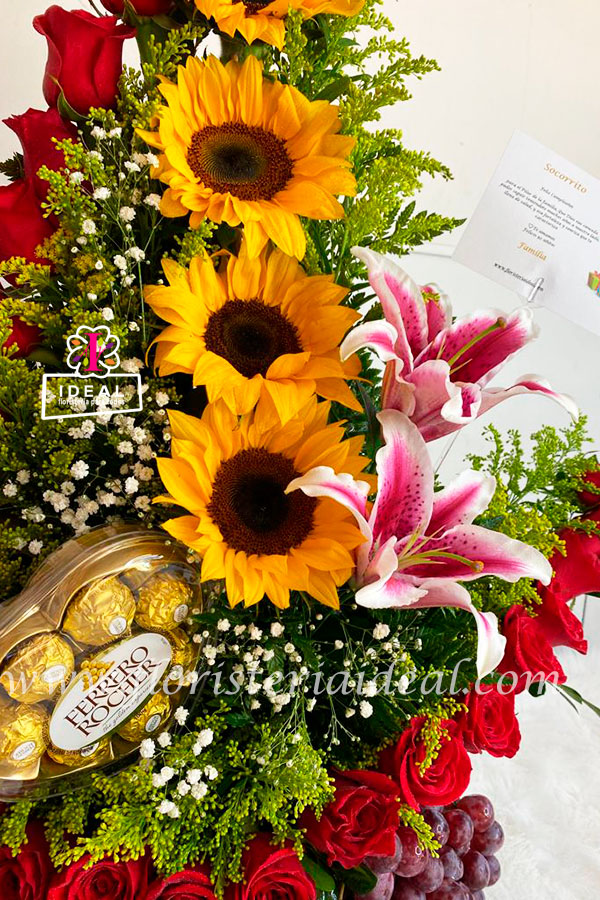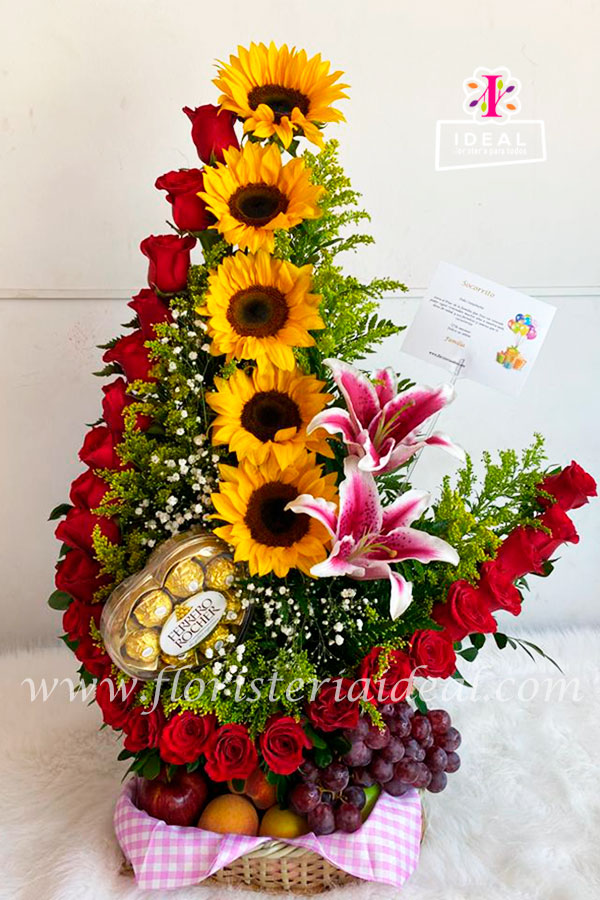 Hermoso arreglo elaborado en rosas y girasoles y lirios acompañado lindos follajes, frutas, y chocolates mas tarjeta para la ocasión