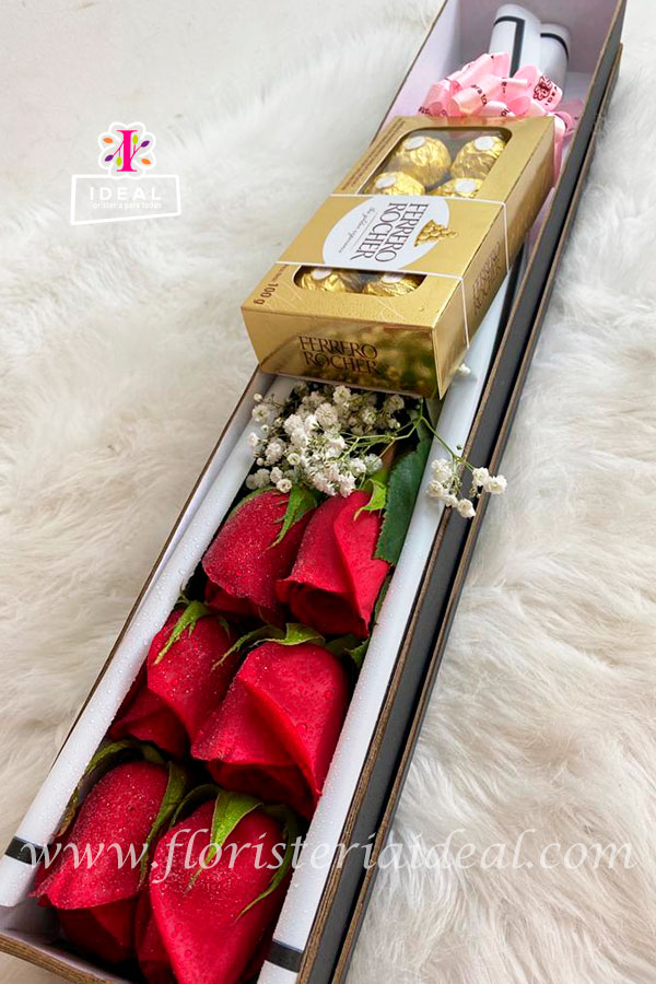 Delicada caja floral de rosas rojas acompañado de deliciosos chocolates Ferrero Rocher con su respectiva tarjeta y mensaje deseado.