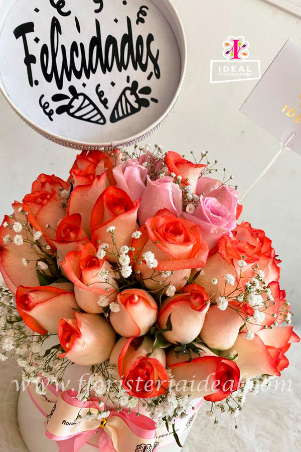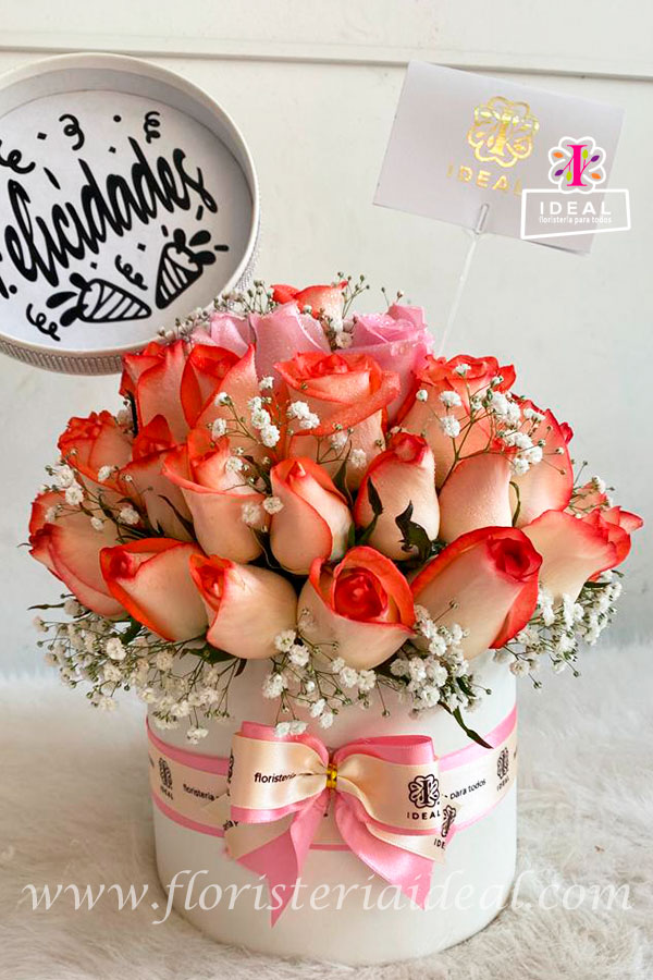 Delicado detalle redondo en rosas, elaborado en caja tipo cuerina con su respectiva tarjeta con mensaje deseado.