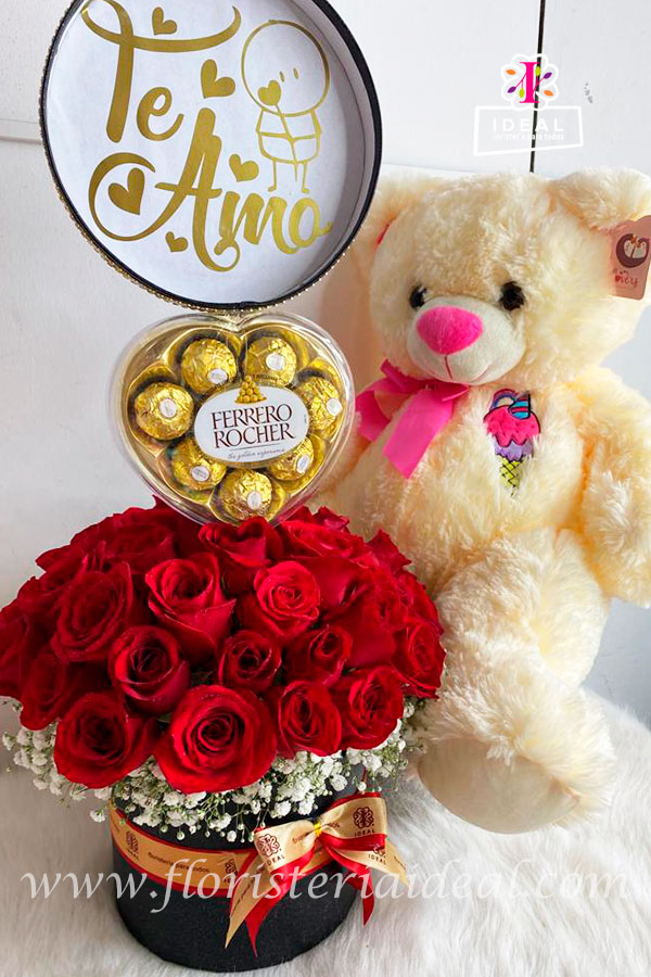 Hermoso arreglo floral en forma redonda de elaborado en bellas rosas y caja tipo cuerina acompañado de tierno peluche , tapa marcada a la ocasión, chocolates Ferrero Rocher y su respectiva tarjeta con mensaje deseado.