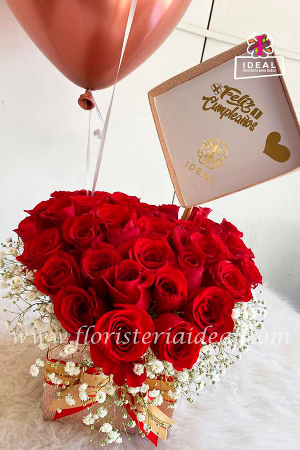 Hermoso arreglo floral en forma corazón de elaborado en bellas rosas y caja tipo cuerina acompañado de tapa marcada a la ocasión, y su respectiva tarjeta con mensaje deseado.