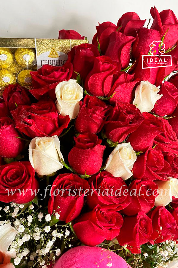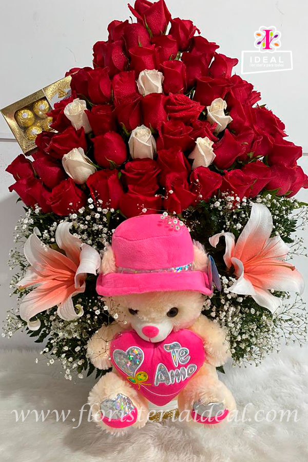Delicado ramo floral con rosas y lirios ,tierno peluche acompañado de deliciosos chocolates Ferrero Rocher y su respectiva tarjeta con mensaje deseado .