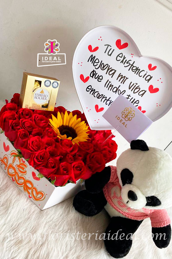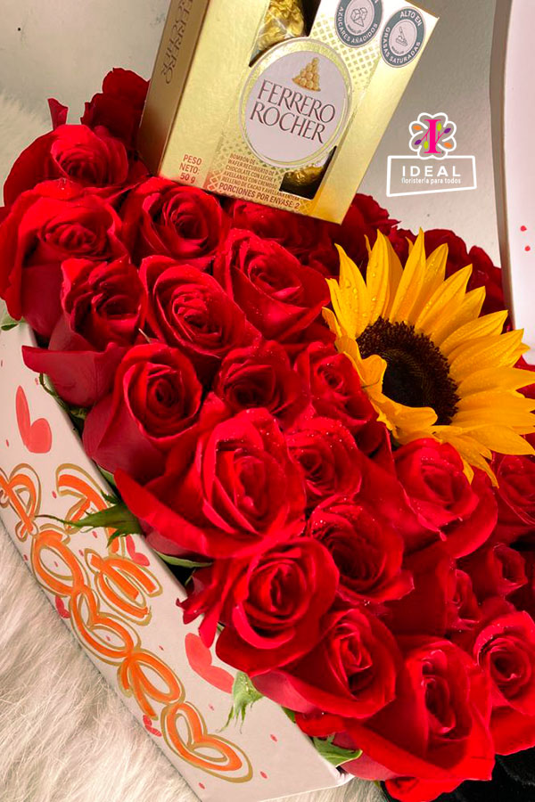 Delicado arreglo floral elaborado en bellas rosas acompañado de un lindo girasol mas chocolates ferreros y lindo peluche también lo acompaña lindo mensaje para la ocasión.
