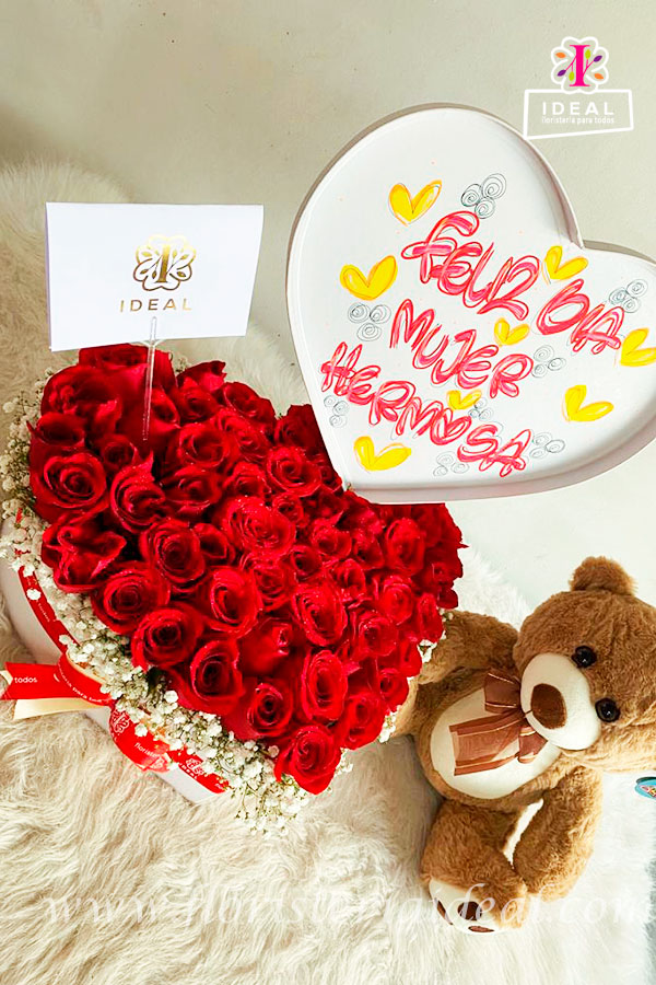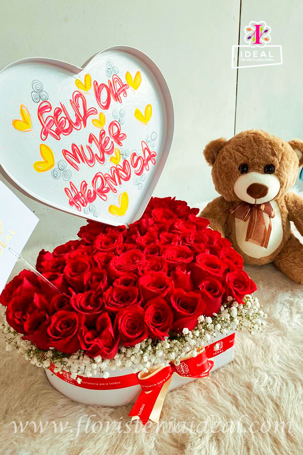 Delicada caja floral con rosas y un girasol en forma de corazón acompañado de tierno peluche , su respectiva tarjeta con mensaje deseado para la ocasión .