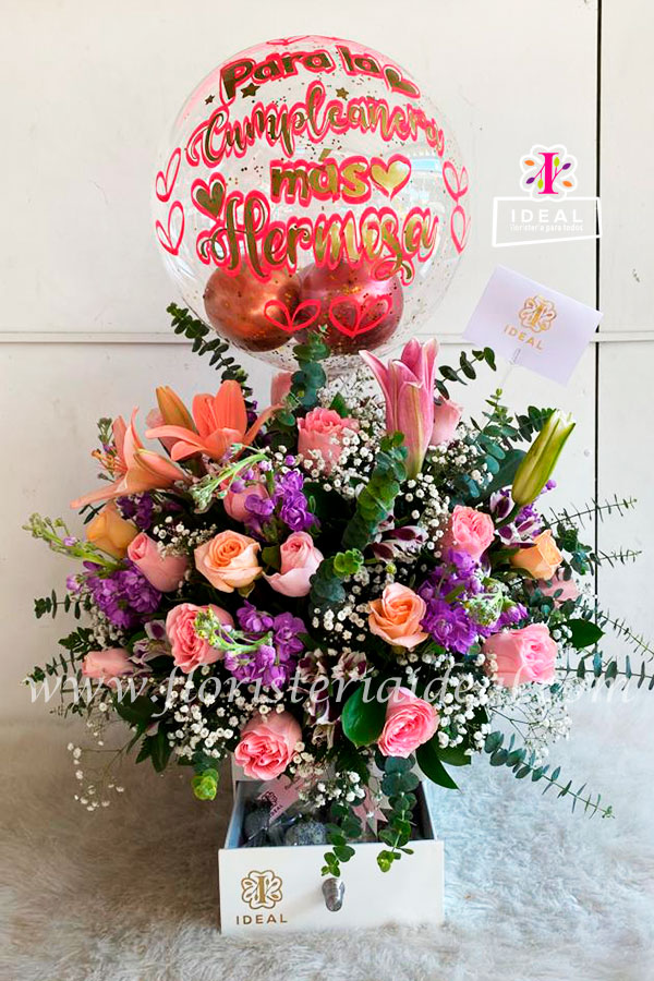 Delicado especial arreglo elaborado con bellas rosas bellos alelis y hermosos follajes incluye globo y choco fresas, y tarjeta para ocasión,