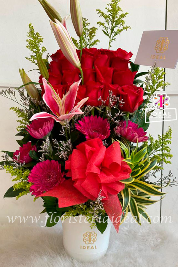 Arreglo floral elaborado con bellas rosas y delicados follajes su base en un valde y lo acompaña tarjeta con mensaje deseado.- cantidad de rosas 15 unidades