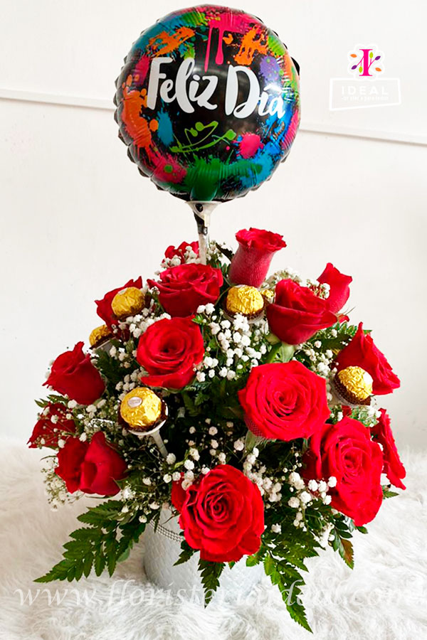 Hermoso ramo floral en rosas ,chocolates Ferrero Rocher , globo metalizado elaborado en ,maseta de pasta ,acompañado de su respectiva tarjeta con mensaje deseado .