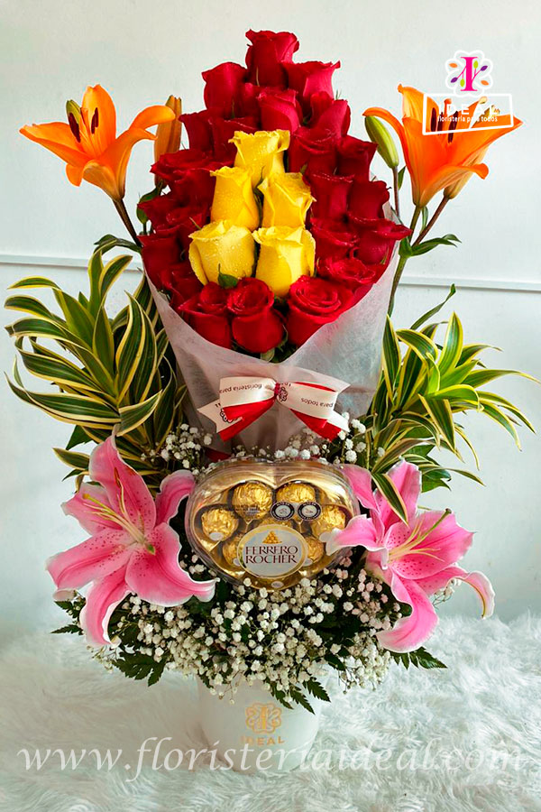 Lindo ramo floral en rosas hermosas acompañado de chocolates Ferrero Rocher y tarjeta con mensaje deseado para la ocasión.