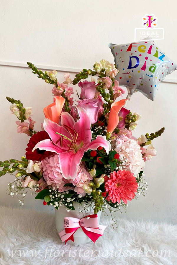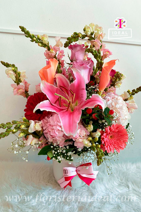 Delicado arreglo floral elaborado en flores tropicales como, lirios, rosas tonos pasteles, hortensias y lindos follajes su base es una caja con lindo decorados incluye tarjeta para la ocasión