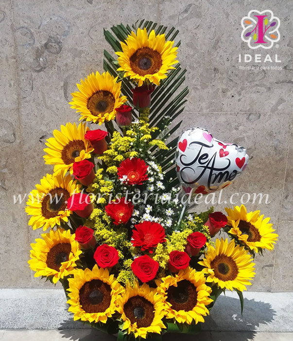 lindo arreglo floral elaborado con bellos girasoles lindas rosas y tiernos follajes acompañado de globito con mensajito y tarjeta.