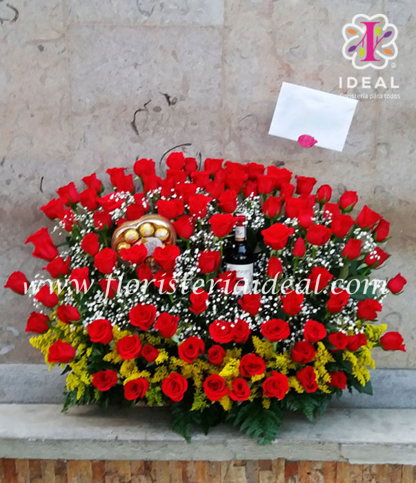 sorprenda a este lindo ser con este sensacional arreglo floral elaborado con las mas hermosas rosas rojas y bellos follajes. esta acompañado de delicioso vino y ricos chocolates ferreros. incluye tarjeta...este lindo arreglo es especial.