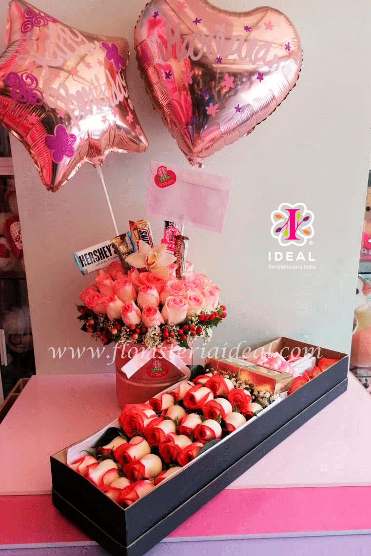 Espectaculares arreglos florales elaborados en bellas cajitas para sorprender a esa personita especial, incluye globos, chocolates y su respectiva tarjeta personalizada.