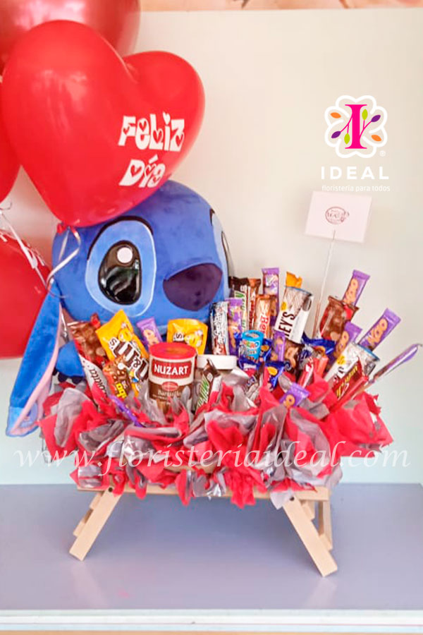 Espectacular Arreglo elaborado con variedad de Chocolates acompañado de espectacular Stick de 60 cm, incluye globos en helio y tarjeta para la ocasión