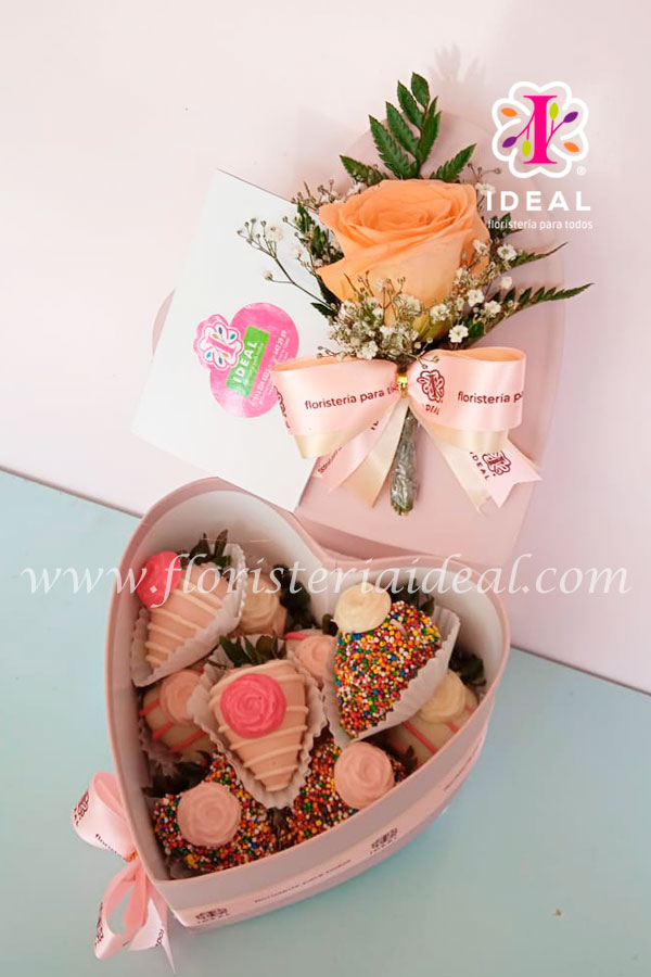 Delicada Caja en forma de Corazón decorada con 8 fresas bañadas en chocolate y tarjeta para la ocasión.