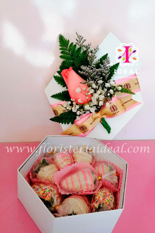 Delicado arreglo floral elaborado en 8 deliciosas fresas bañadas en chocolate acompañado de linda tarjeta para la ocasión.