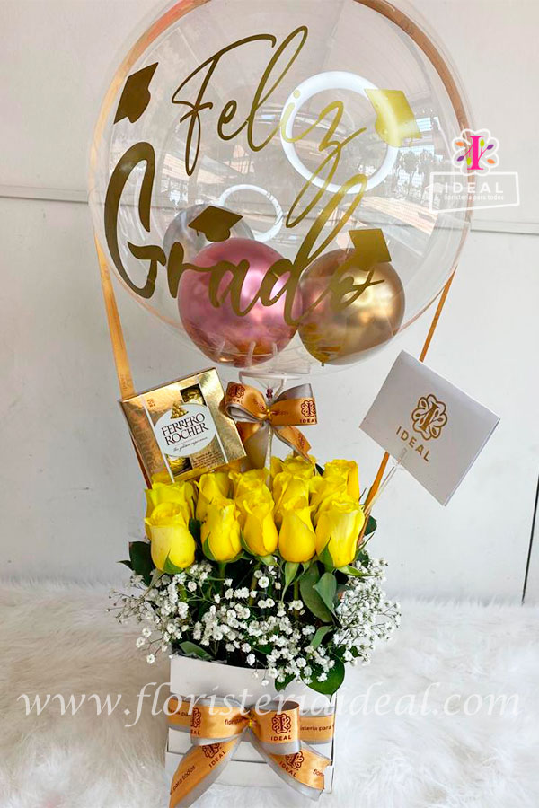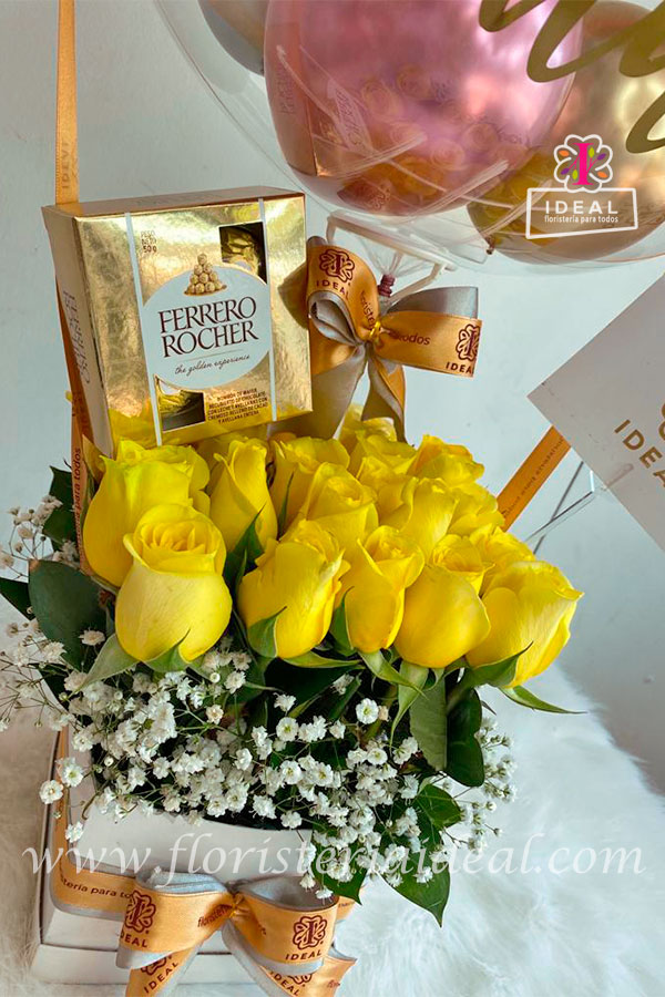 Caja cuadrada elaborada en rosas amarillas acompañada de deliciosos chocolates ferrero y globo sintético personalizado, incluye tarjeta para la ocasión.