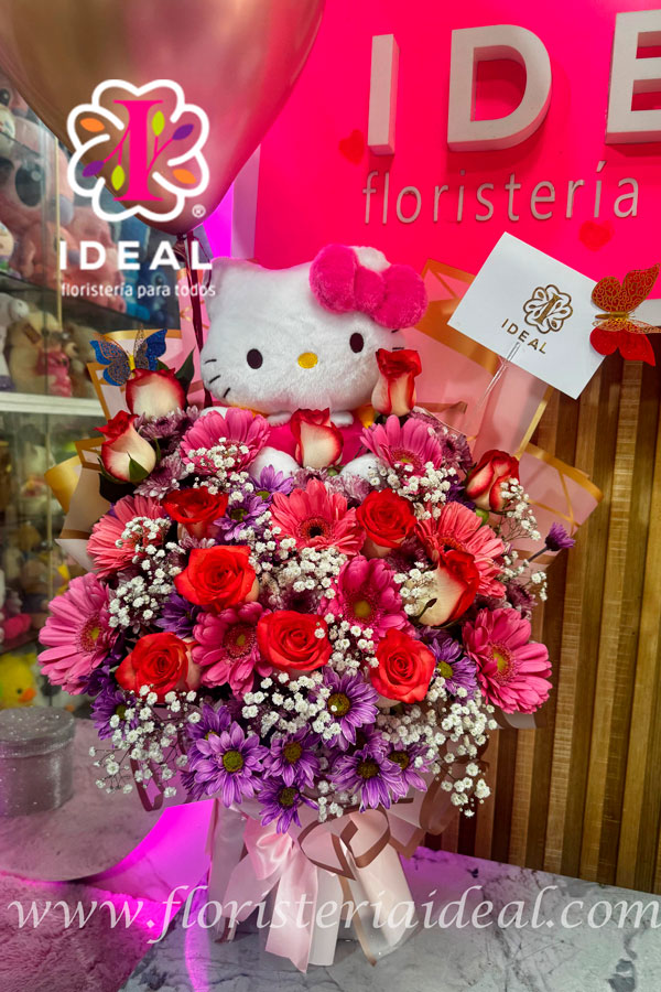 Arreglo floral elaborado en bellas rosas y margaritas acompañado de tierno peluche y tarjeta para la ocasión