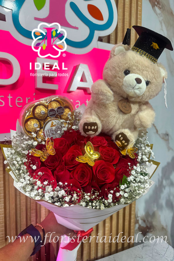 Delicado arreglo floral tipo buchon decorado con lindas rosas acompañado de deliciosos chocolates ferreros y tierno oso de peluche incluye tarjeta para la ocasión.