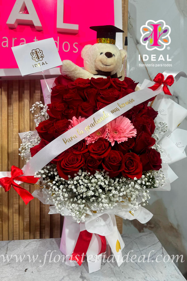 el osito tedy es el compañero perfecto para este hermoso arreglo elaborado en rosas rojas acompañado de una hermosa cinta