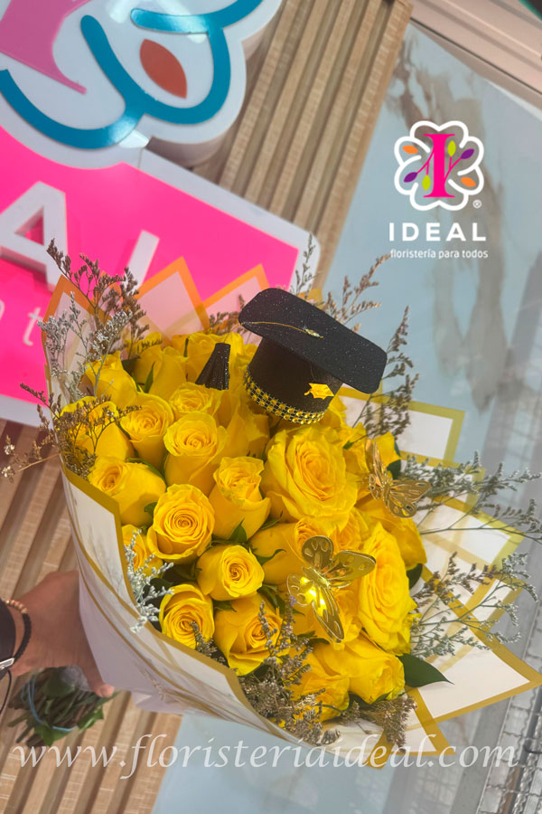 hermoso arreglo floral elaborado en rosas amarillas acompañado de un hermoso birrete con un aproximado de 3 docenas de rosas.