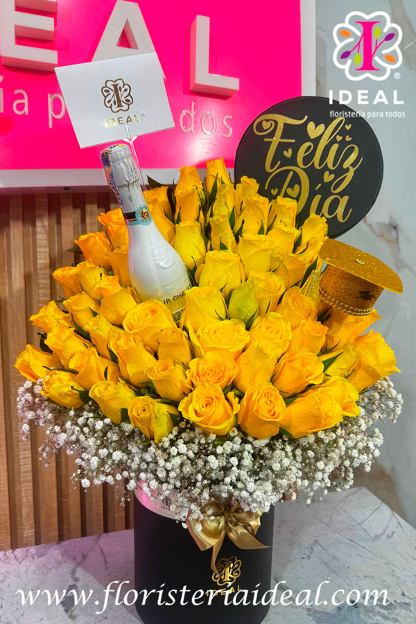 Lindo arreglo floral, elabora en bellas rosas, caja redonda con mensaje representativo, este arreglo es especial para grado