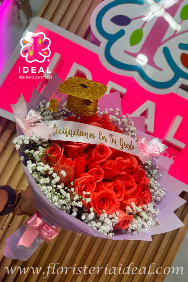 Lindo arreglo buchon, elaborado con lindas rosas color Salmon, incluye cinta de grado y birrete mas tarjeta para la ocasión