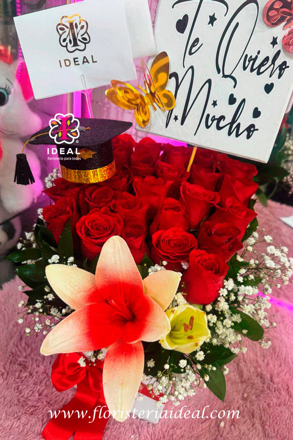 hermosa caja cuadrara elaborado en rosa roja con un lirio perfecta para cualquier ocasión