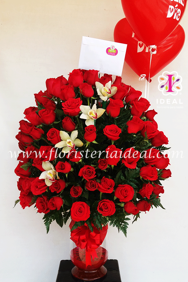 Especial arreglo de rosas rosas rojas acompañado de delicadas orquídeas y finos follajes verdes su forma es redonda y lo acompaña una base de vidrio + delicada corbata roja incluye 2 globos en helio y tarjeta para esta especial ocasión.( cantidad de rosas 120 unidades)