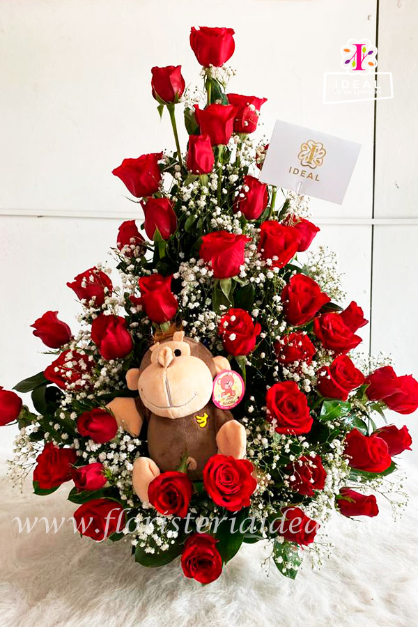 Delicado ramo floral en rosas rojas tipo pirámide acompañado de tierno peluche con su respectiva tarjeta y mensaje deseado .