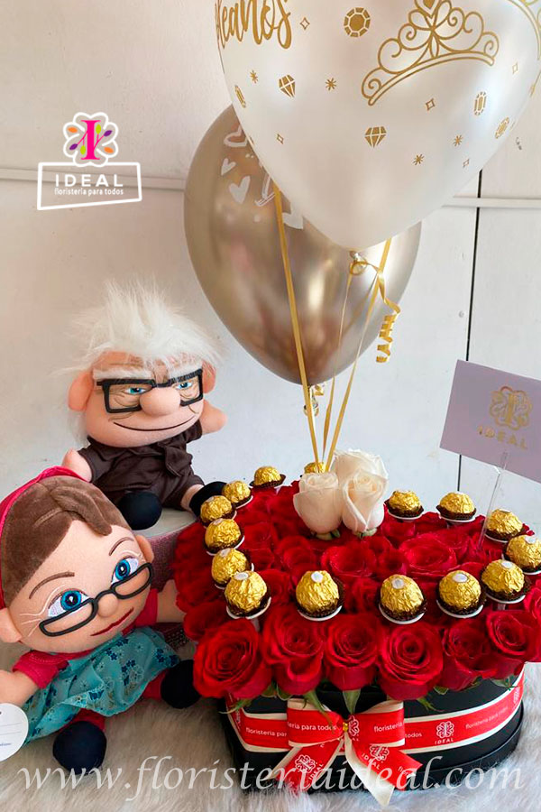 Hermosa caja de rosas llamativas de excelente calidad , la caja en forma de corazón en efecto cuerina acompañada de tierno peluche pelicula UP , globos en helio con su respectivo lazo (moño) y tarjeta con mensaje deseado