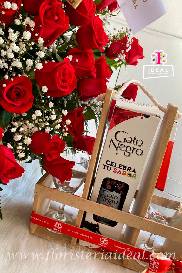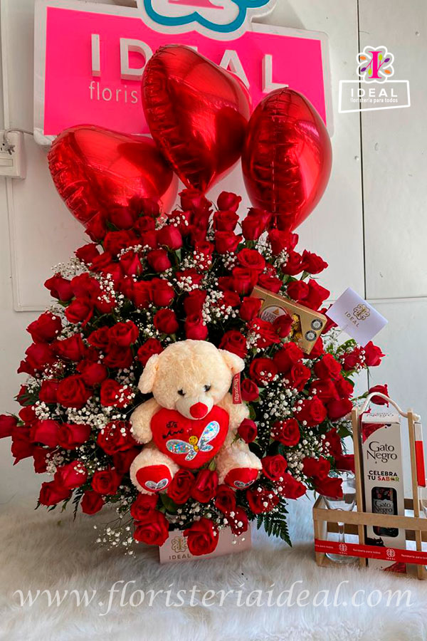 Especial arreglo floral PREMIUM elaborado en rosas acompañado por tierno peluche, chocolates Ferrero Rocher y globos metalizados , caja de madera con dos copas y botella de vino incluye tarjeta para la ocasión con mensaje deseado.