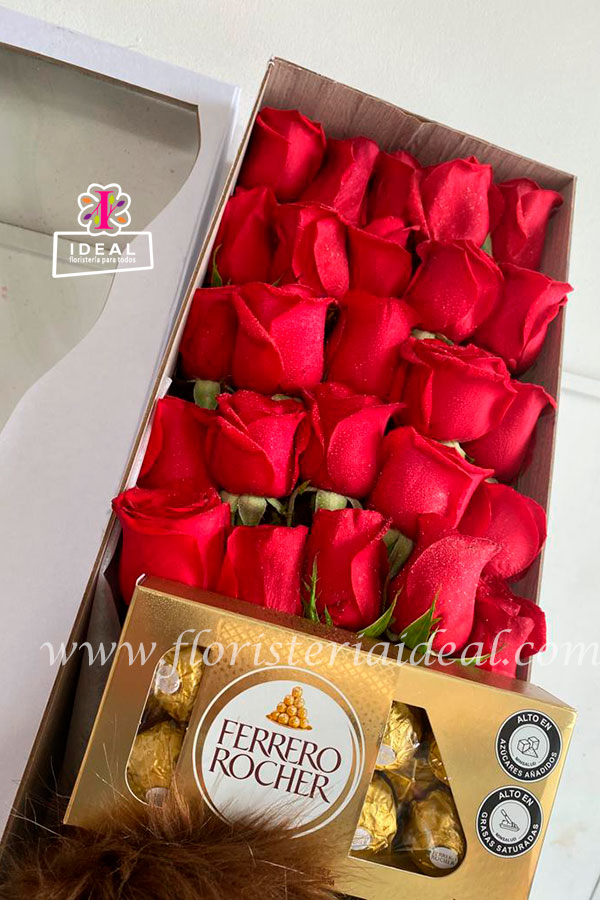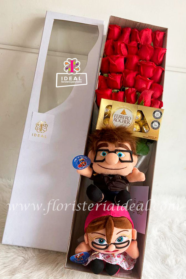 Delicado y sorprendente arreglo floral elaborado en bellas rosas acompañados de dos lindos abuelos de la pelicula up esta acompañado de ricos chocolates ferreros y tarjeta para la ocasión.