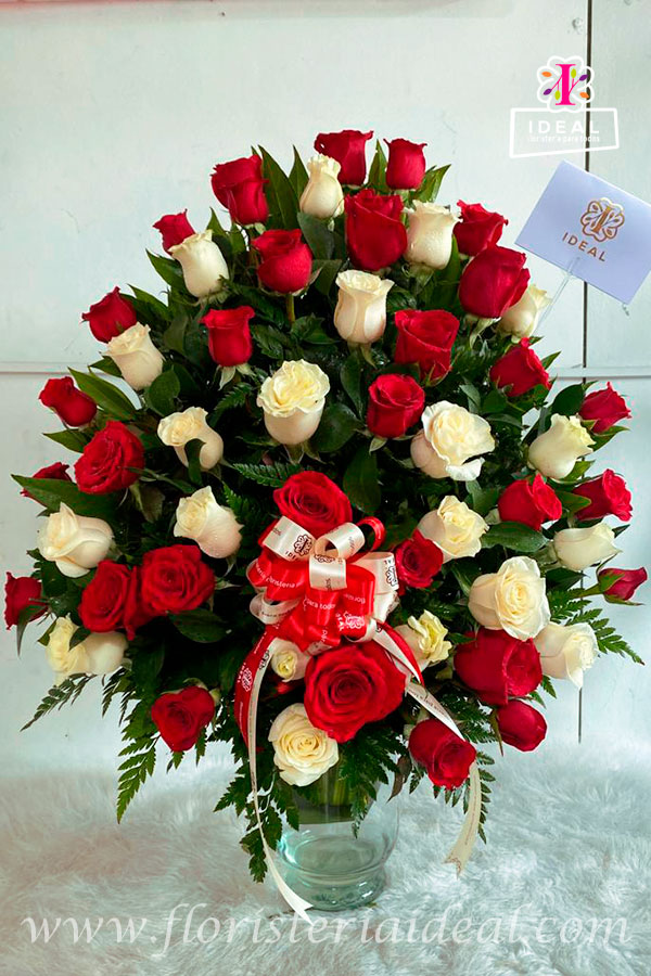 Delicado arreglo floral elaborado en bellas rosas ,base de jarrón en vidrio, respectivo moño, acompañado de tarjeta para la ocasión con mensaje deseado.