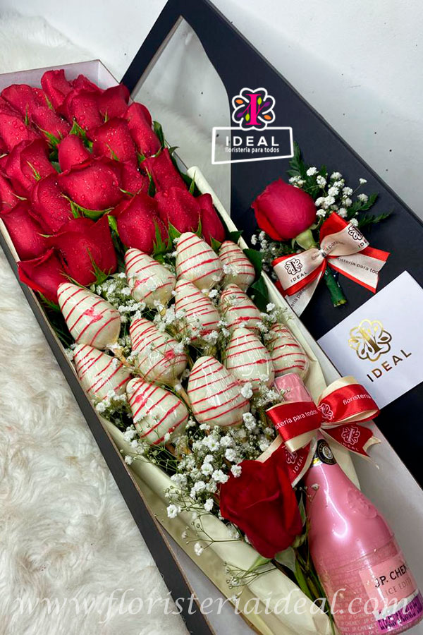 Hermosa caja alargada elaborada en bellas rosas rojas, acompañada de deliciosas chocofresas y botella de JP mas tarjeta personalizada para la ocasión, tu detalle ideal para tu persona especial.