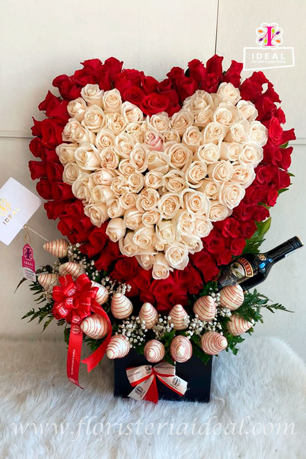 Hermoso ramo floral PREMIUM elaborado en bellas rosas rojas y blancas, con deliciosas chocofresas y botella de beylis, mas tarjeta personalizada para la ocasión.