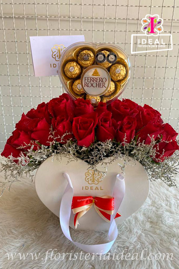 Hermoso arreglo elaborado en bellas rosas rojas en base de cartera de corazon, mas deliciosos chocolates ferrero en estuche de corazon, y tarjeta personalizada para la ocasión